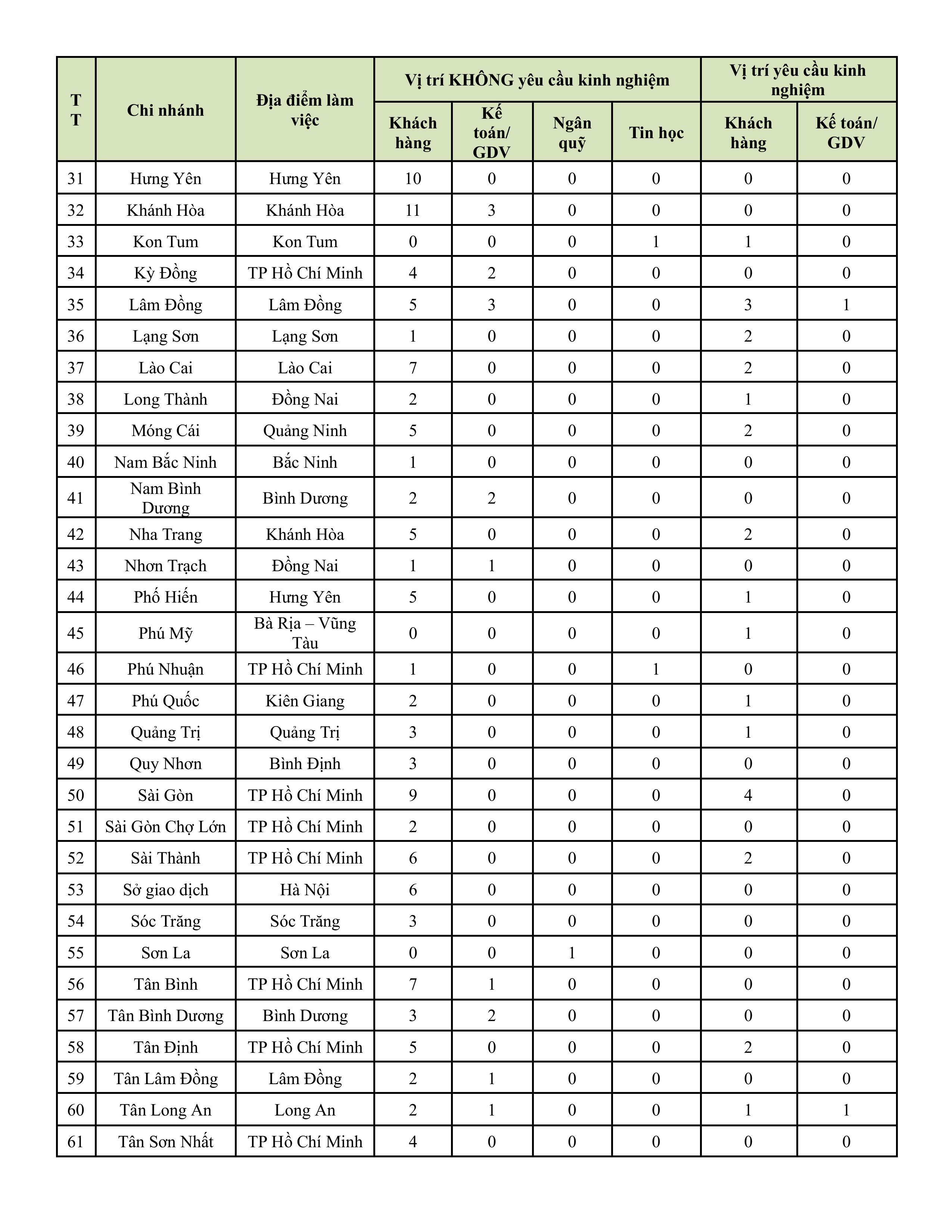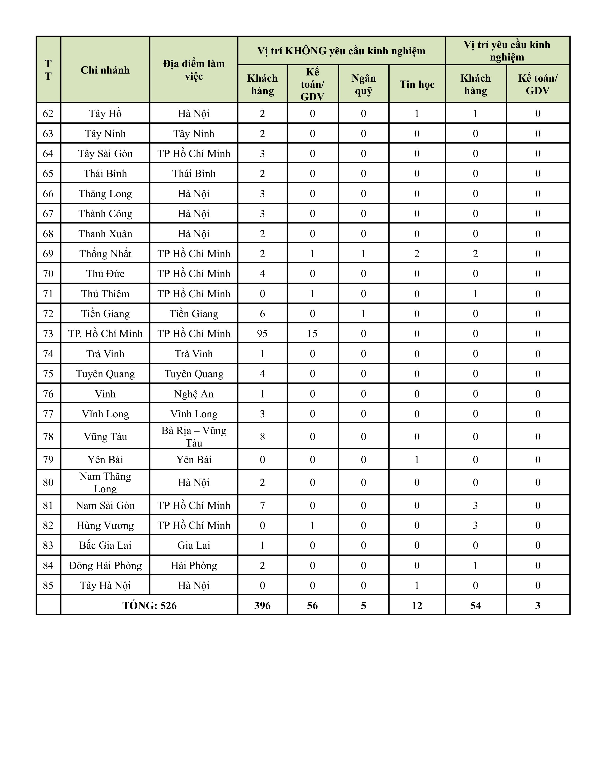 I. Chỉ tiêu tuyển dụng của các chi nhánh (có thể thay đổi trong quá trình tuyển dụng)